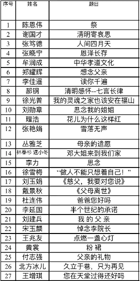 辽宁福山公墓杯“忆四月 念亲恩”征稿大赛于3月初正式开启。以文学的形式,唤起人们对逝去亲人的思念之情,也让我们敞开心扉,追忆那些熟悉的面容,说说那些曾经来不及说的话,把清明时节的纷纷雨丝,化作字里行间的绵绵思念……活动通过前期的宣传、征集,有近千篇作品涌入到邮箱中,辽宁福山公墓和抚顺广播电视台的工作人员,经过前期大量的筛选、一次次的沟通,最终有近90篇的作品最终入围。
